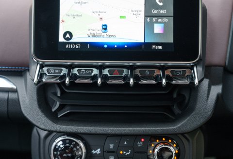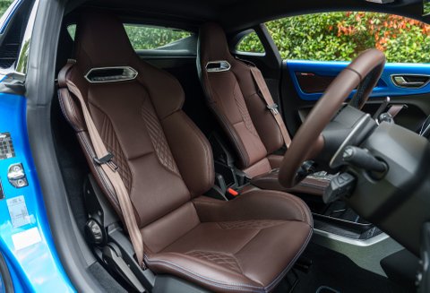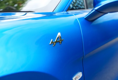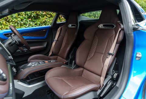 Inside, the A110 GT features a refined and elegant interior, highlighted by Blue-stitched Legende Brown leather seats. This combination of rich leather and subtle blue accents creates a sophisticated and sporty atmosphere. The cabin is designed with the driver in mind, offering intuitive controls, a digital instrument cluster, and a high-quality infotainment system.