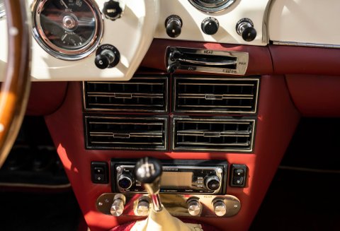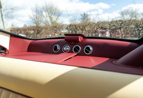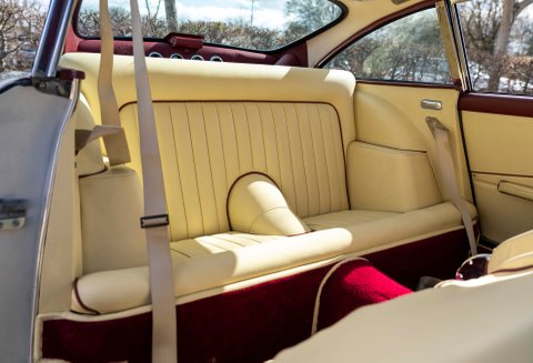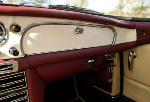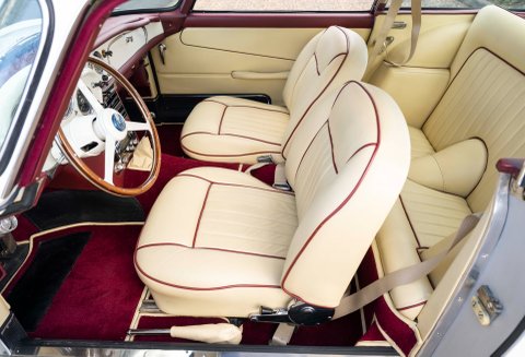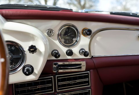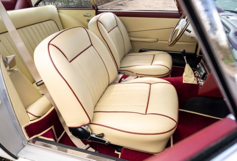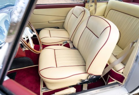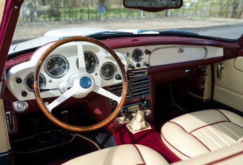 Presented in Dove White coachwork with Magnolia Connolly hide - piped Oxblood. Matching Wilton carpets leather bound throughout the car including the boot, webbing trimmed seatbelts to match the main hide - chrome fittings with AM wings. Instrument facia and body coloured Moto-lita steering wheel finish off the beautiful cabin. Chrome wire wheels with twin ear spinners fitted with Avon tires and full stainless steel sport exhaust.