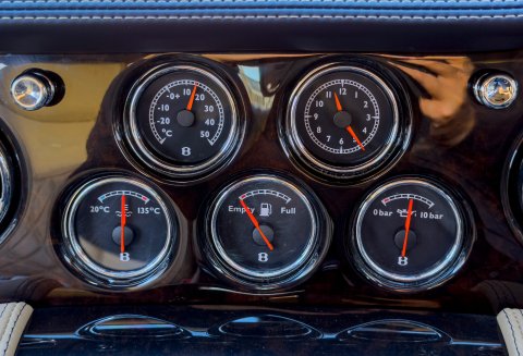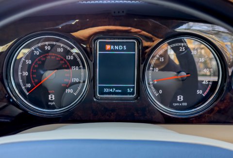 - Dark-stained Burr Walnut half-wood steering wheel, veneered to match the wood set