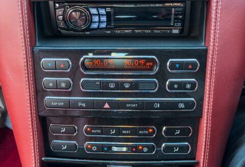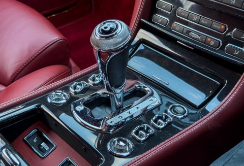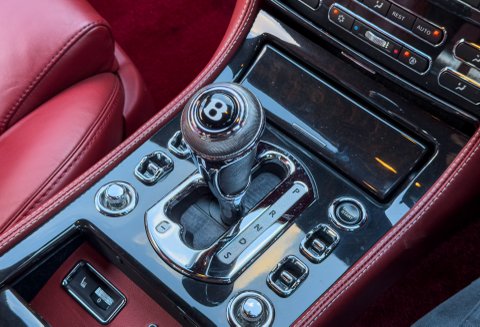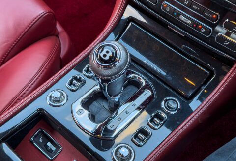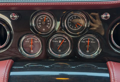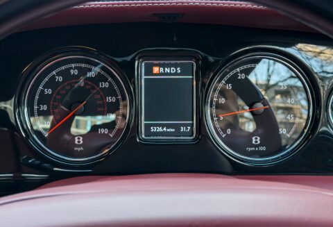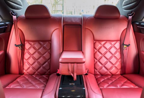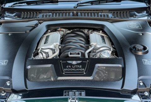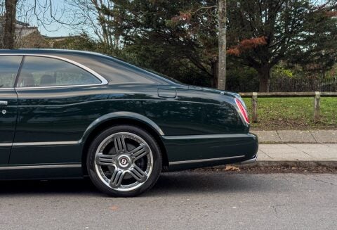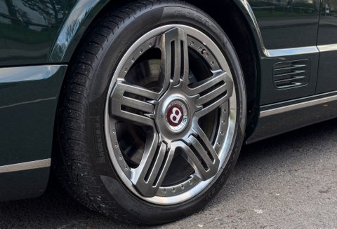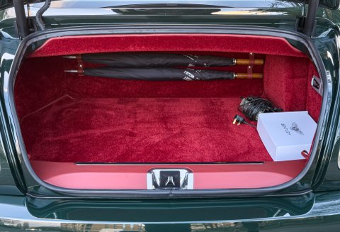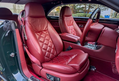 Finished in Special Order Barnato Green, this Bentley features Fireglow leather upholstery with diamond-quilted seat facings and matching door cards, each embroidered with Bentley emblems. The carpets and seat belts are colour-matched to the main hide, while the toprol is finished in two-tone leather with contrasting stitching. Dark Vavona veneers add a touch of understated elegance, with recessed Bentley Flying B badges set into the waistrails, alongside chrome strips and dark red emblems that complement the bonnet and boot lid badges.
