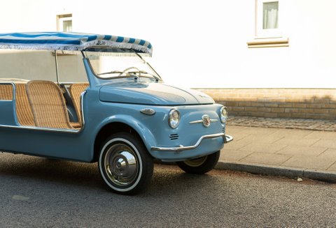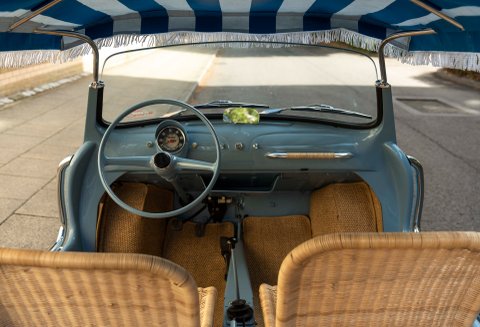 The first Jollys’ were built on the two-cylinder Fiat 500 platform and then sent to Ghia, the famous Italian Coachbuilder to be modified. This involved removing the roof and doors and adding wicker seats and a fringed canvas top and strengthening the chassis frame. A version based on the larger 600 soon followed. It is believed that no more than 400 Jollys were built in total, between 1958 and 1969. They were briefly sold in the United States and are very rare in Europe.
