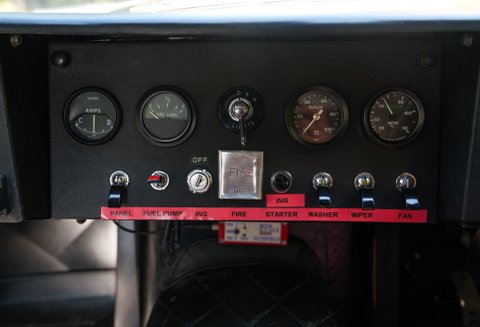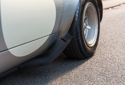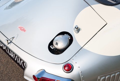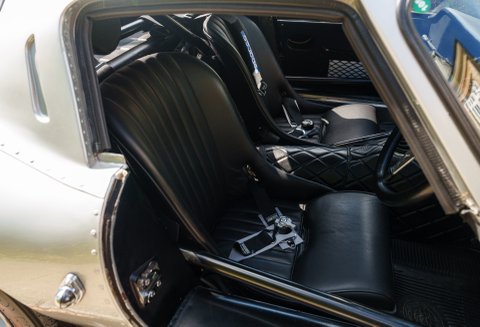 The body is built to the original Low Drag appearance, incorporating a new steel monocoque and updated chassis frames. The bonnet, doors, boot lid, rear wings, and roof were all hand-welded in 16-gauge aluminium to original specification, including the external riveting. The original steel-design windscreen surround encased the low drag, raked laminated safety glass from the original pattern. Driving lamps in the bonnet, a spring-loaded roof vent, a louvered vent panel over fuel pumps, and pit lamps only add to the authentic feel.