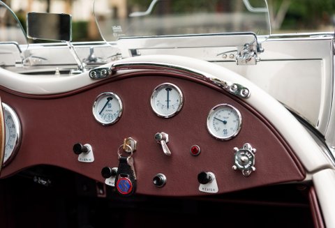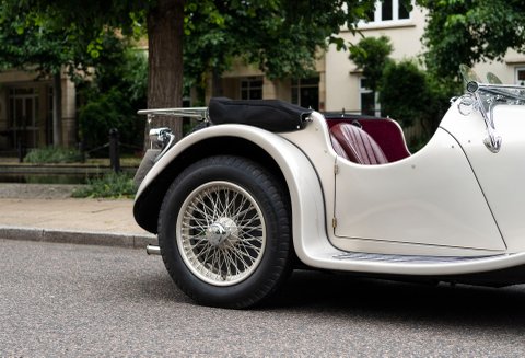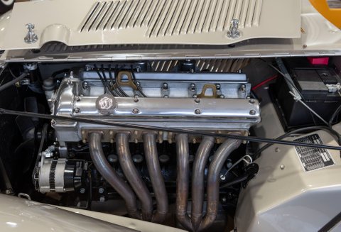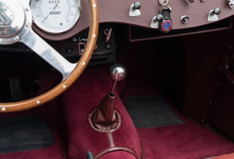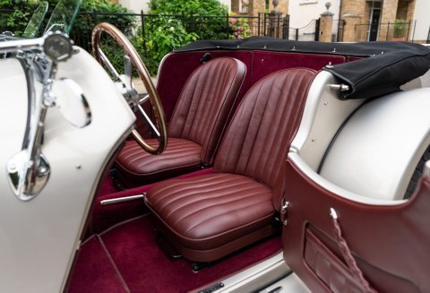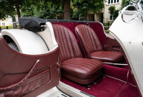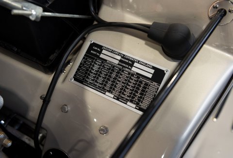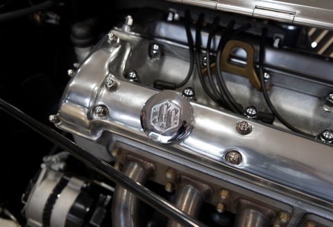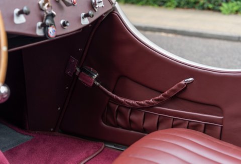 Finished in the striking colour combination of Jaguar Opalescent Champagne Gold coachwork with Bordeaux Red hide. Matching Wilton carpets bound in leather, Bordeaux covered dashboard, door cards with hand stitched grab handles. Ebony Black mohair soft top with matching hood bag and full length wet weather gear. With the added comfort and safety of heated seats and inertia seat belts which are trimmed in classic webbing and Bordeaux Red to match and chrome fittings finish off the classy cabin.