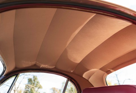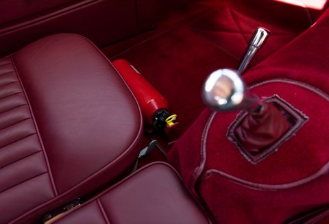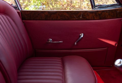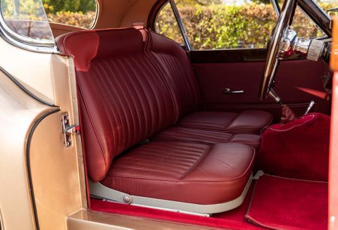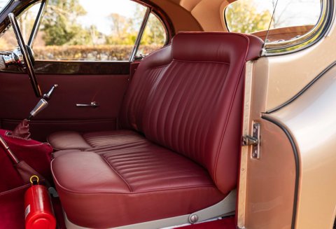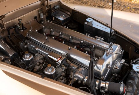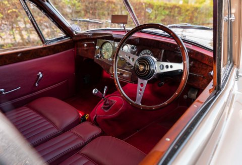 Finished in Jaguar Opalescent Golden Sand with St. James Red hide, carpets trimmed to match with leather binding. The detail and quality to the cabin is exquisite – all the screw heads are regimentally turned inline of each other, the headlining is West of England Wool – the finest of materials used. The Burr Walnut wood work is gleaming throughout, the fitment of 15 inch sports 3 spoke steering wheel which allows more room for the driver and this has also been veneered to match the wood set. Inertia 3-point safety belts have also been trimmed in St James Red to match, chrome fittings with Jaguar leaping cat’s- no expense spared.