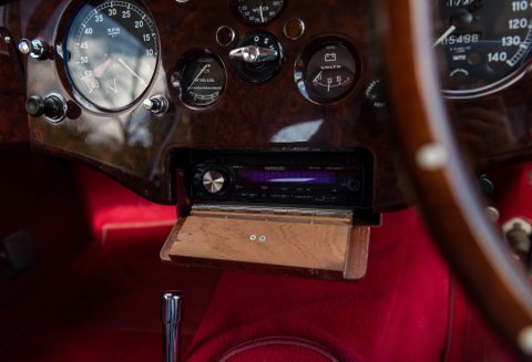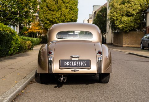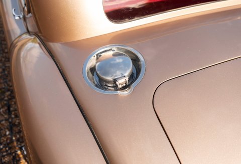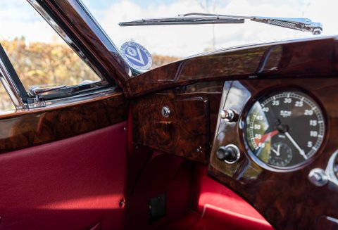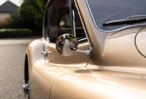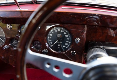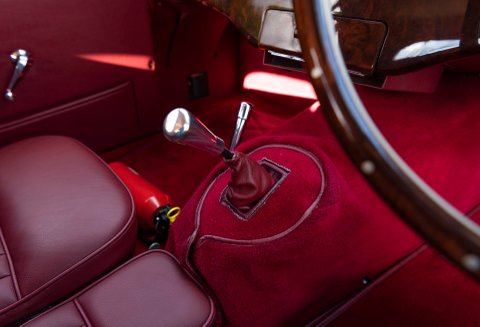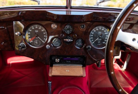 The men who restored this car wanted to showcase their skill set and to the trained eye, it makes that statement - you only notice these incredibly small details when you examine the car at close quarters. Custom made chrome headlamp rings with integrated wire mesh protection, you initially think this had been added and bolts onto the head lamp itself but it is in fact one piece of beautiful chrome - incredible. Polished rocker covers in the engine bay distract you away from the custom handmade aluminium cover over the steering column and polished ignition coil. You then notice the 12-volt alternator and secret cooling fan at the rear of the radiator. A custom-made stainless exhaust single branch running through the chassis and back to two as it comes out – superb rasp and pitch. XK140 steering rack and 150 callipers and discs fitted for improved stopping power, gleaming chrome wire wheels with Vredestein tyres.