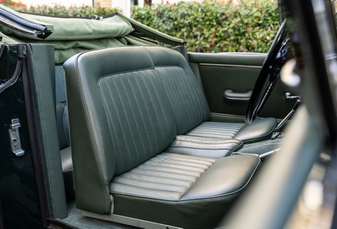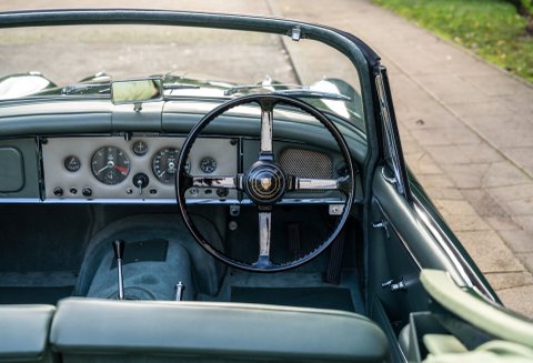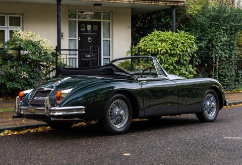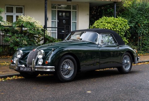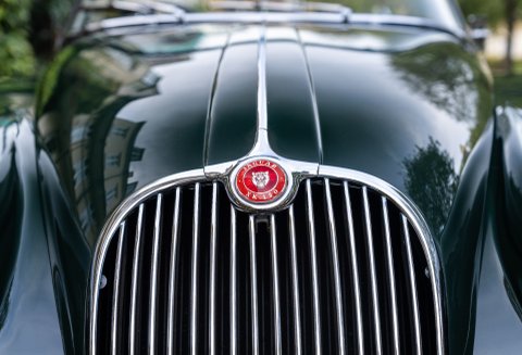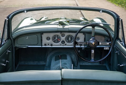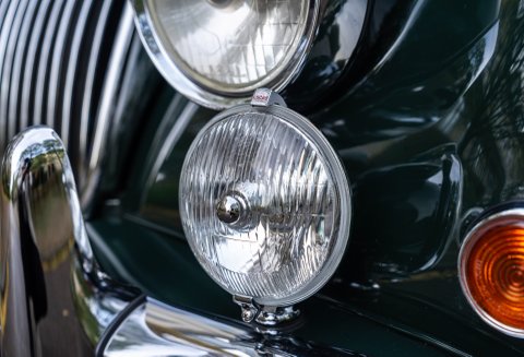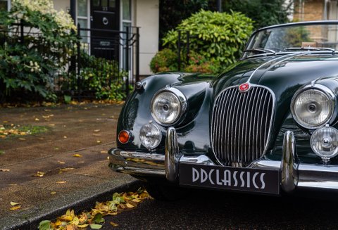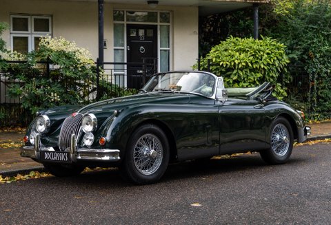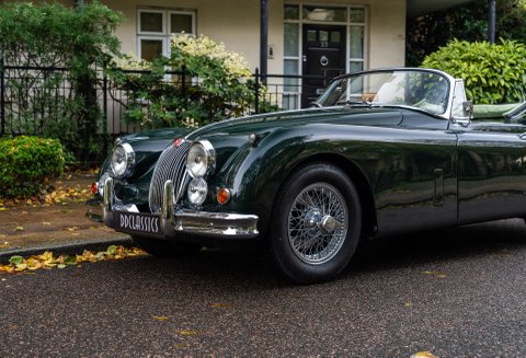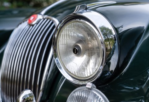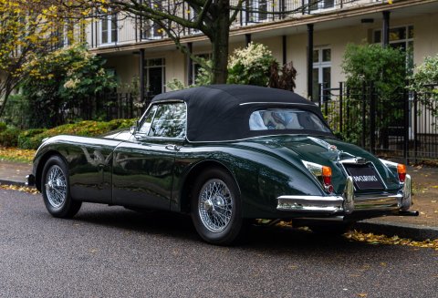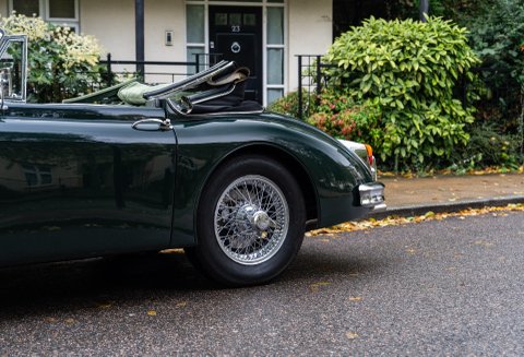 Finished in its original colour of BRG coachwork with Suede Green hide, matching carpets throughout in. Black soft top trimmed in mohair, the attention to detail of the workmanship which went into the trimming is perfection. Equipped with 16'' chrome wire wheels sitting on Pirelli Centurato tyres which makes the Jag look regal on the streets and chrome embossed two ear spinners which add class. Correct 700 head lamps finish off the period look.