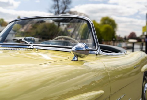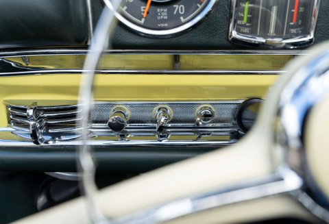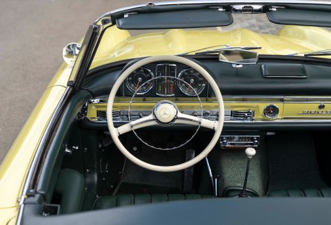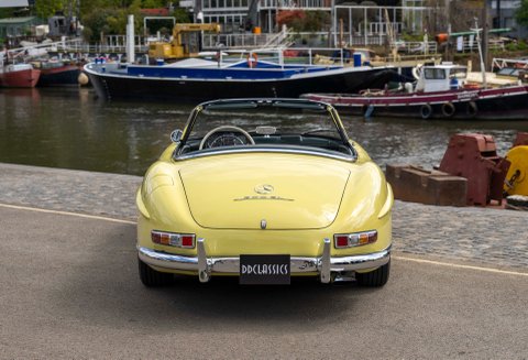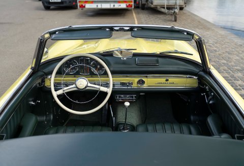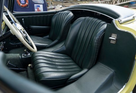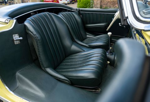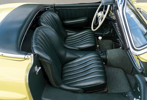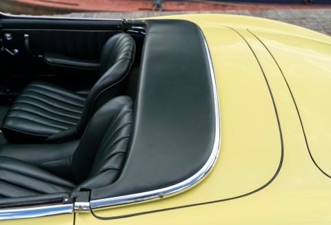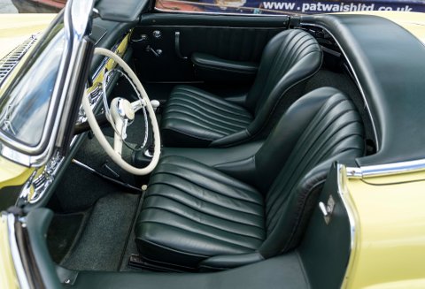 Finished in magnificent Fantasy Yellow coachwork with Pine Green hide, matching top roll and weaved carpets. Mohair soft top trimmed in matching dark green, Ivory steering wheel and gear stick. Fitted with the highly desirable enclosed head lights, the lower ratio rear axel 1:3,89 for the ultimate acceleration and Becker Mexico radio.
