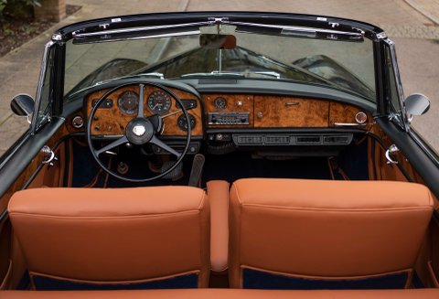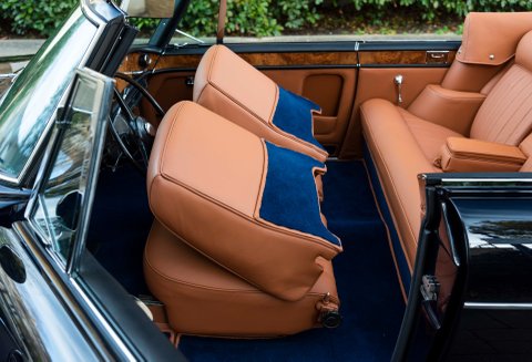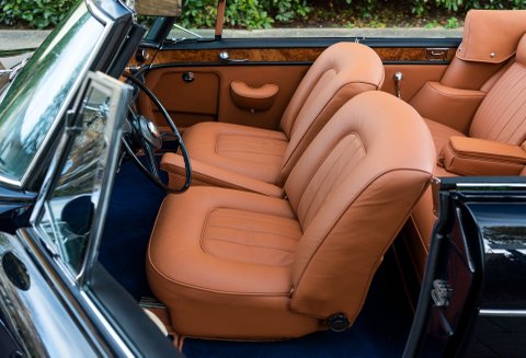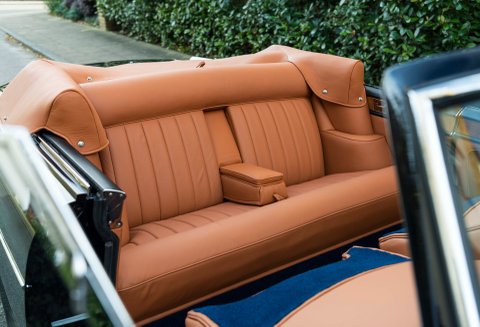 Finished in flawless Rolls-Royce Midnight Blue coachwork with London Tan hide, new Royal Blue Wilton carpets throughout, piped in matching Tan. Brand new Blue mohair soft top with the correct wool headlining, Tan hood bag to match main hide and hand painted single coach lines on the wheel trims finish off this special car.